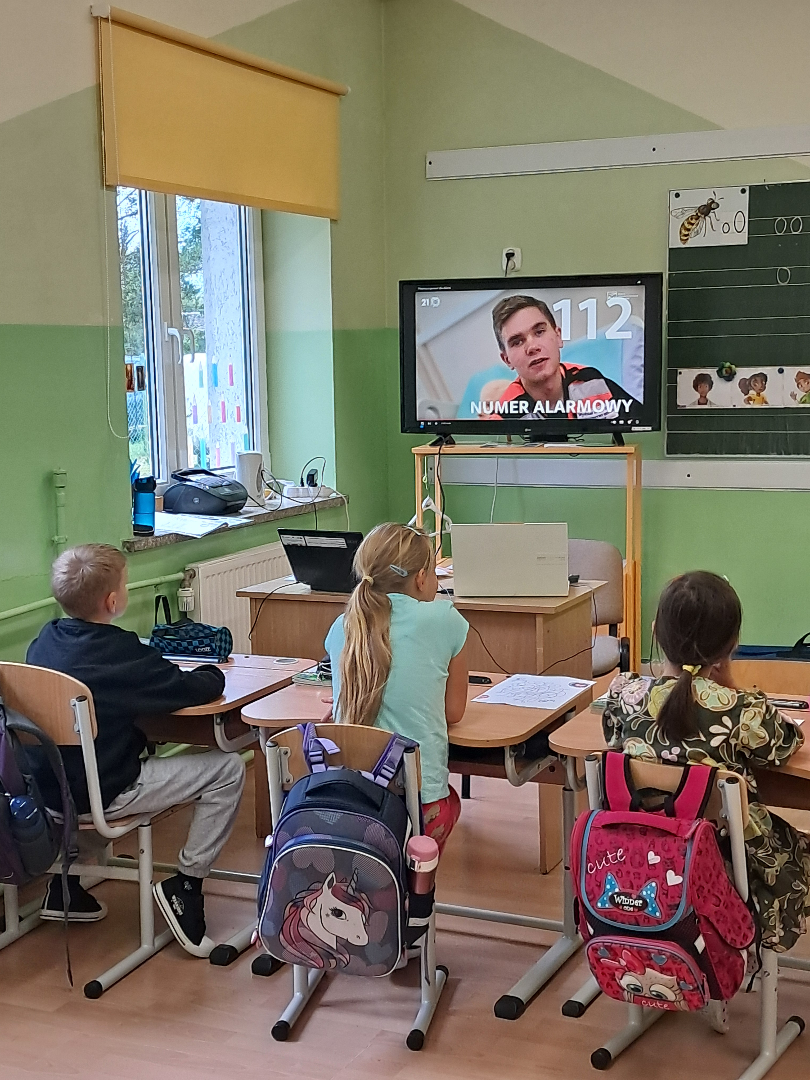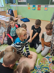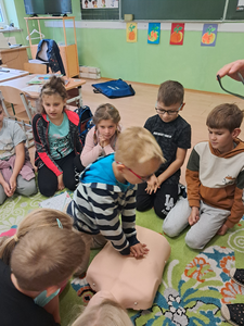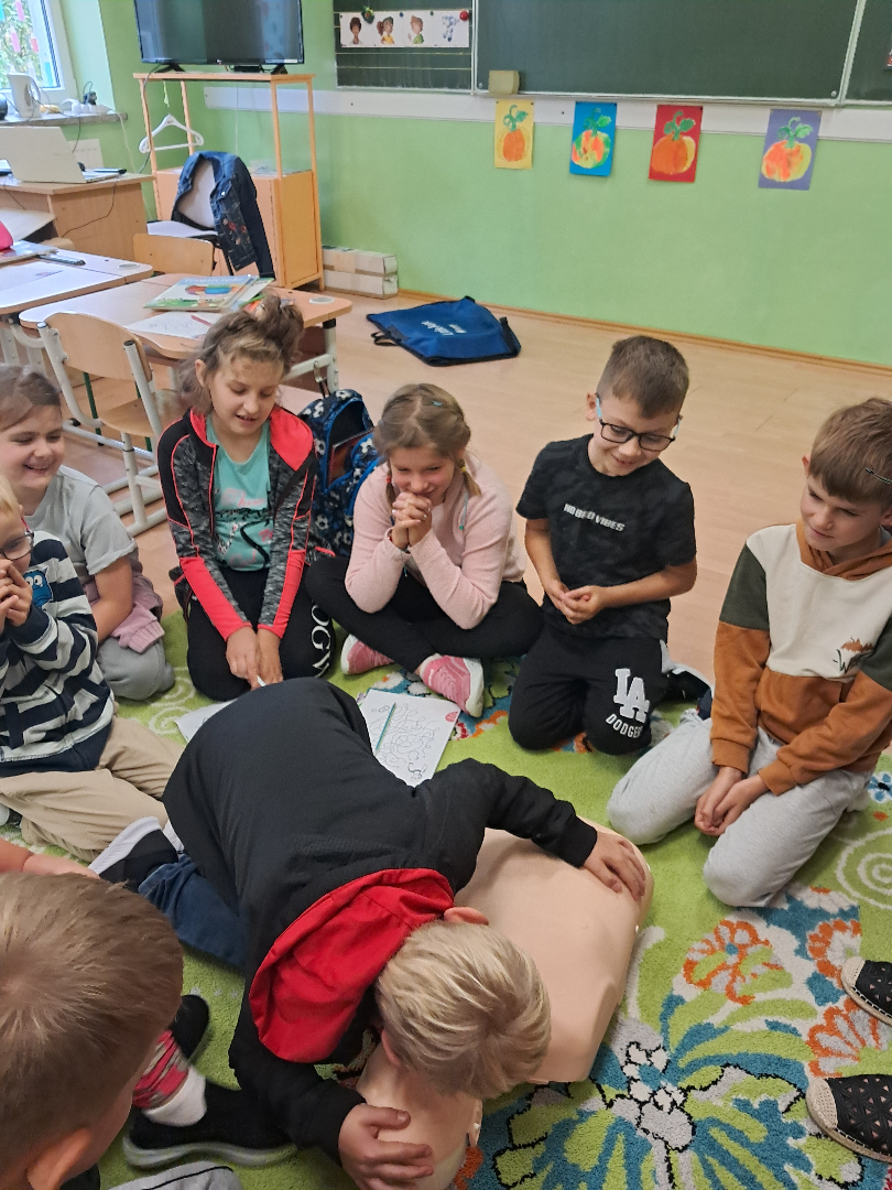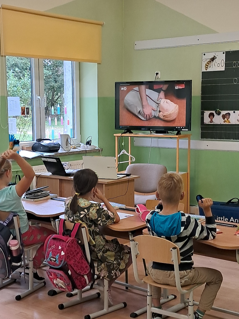 17 września 2025 r. dzieci z klas najmłodszych wzięły udział w warsztatach profilaktycznych dotyczących nauki udzielania pierwszej pomocy przedmedycznej. Zajęcia przeprowadziła pani Anna Wasiluk. Oglądając film edukacyjny uczniowie z uwagą obserwowały czynności ratownicze i sposoby zachowania się w sytuacjach zagrożenia zdrowia i życia. Utrwaliły także znajomość numerów alarmowych. Szczególne zainteresowanie wzbudził pokaz resuscytacji wykonywany na fantomie. Po pokazie każdy z uczestników mógł poczuć się jak mały ratownik i samodzielnie wykonać pierwszą pomoc.