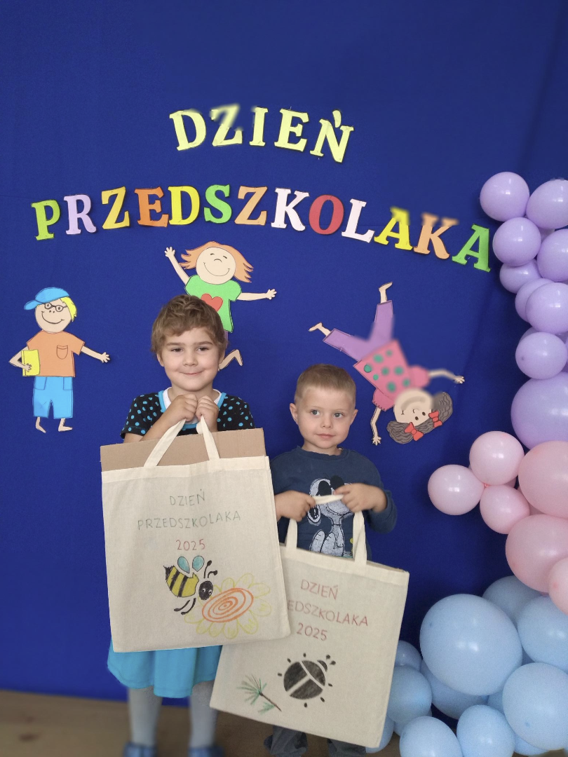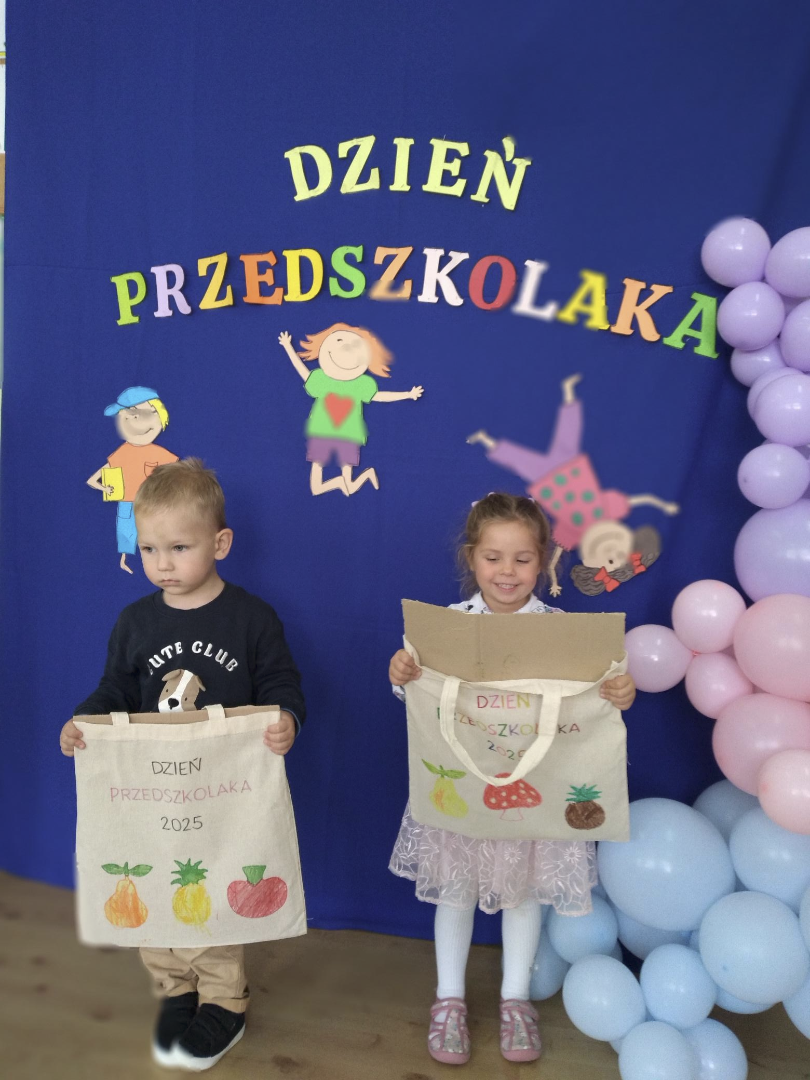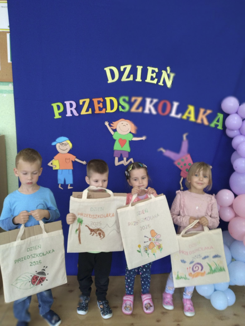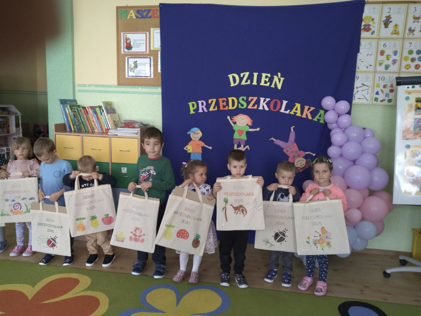 Tego dnia czekało na dzieci wiele niespodzianek i atrakcji przygotowanych przez nauczycieli, rodziców i współpracującą z nami bibliotekarkę Panią Mirosławę Siemieniuk-Morawską. W naszej sali rozbrzmiewała wesoła, skoczna muzyka i śpiew od samego rana. Bawiliśmy się w popularne zabaw grupowe, integracyjne, które powinien znać każdy przedszkolak min. Karuzela, Dwóm tańczyć się zachciało czy Boogi. Tańczyliśmy również do muzyki filmowej z kolorowymi, neonowymi chustami oraz z gumą sensoryczną. Wszystkie przedszkolaki- maluchy i starszaki z kolorowych liter układały hasło-DZIEŃ PRZEDSZKOLAKA, zapoznając się z literami, a przy okazji ćwicząc spostrzegawczość wzrokową i uwagę. Było również zadanie kreatywne- każdy projektował na lnianej ekotorbie wzór graficzny używając do tego szablonów i pisaków do tkanin. Następnie odbyła się sesja fotograficzna oraz wręczenie dyplomów i medali super przedszkolaka, a także drobnych upominków zakupionych przez rodziców.