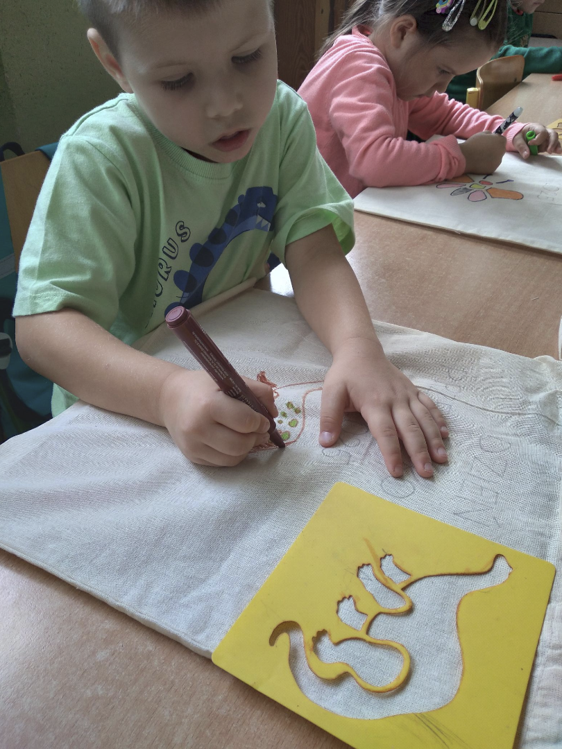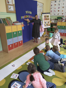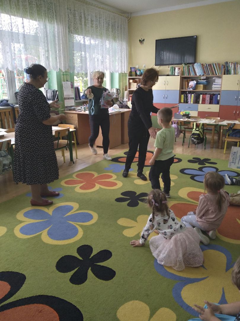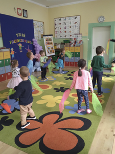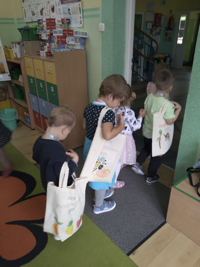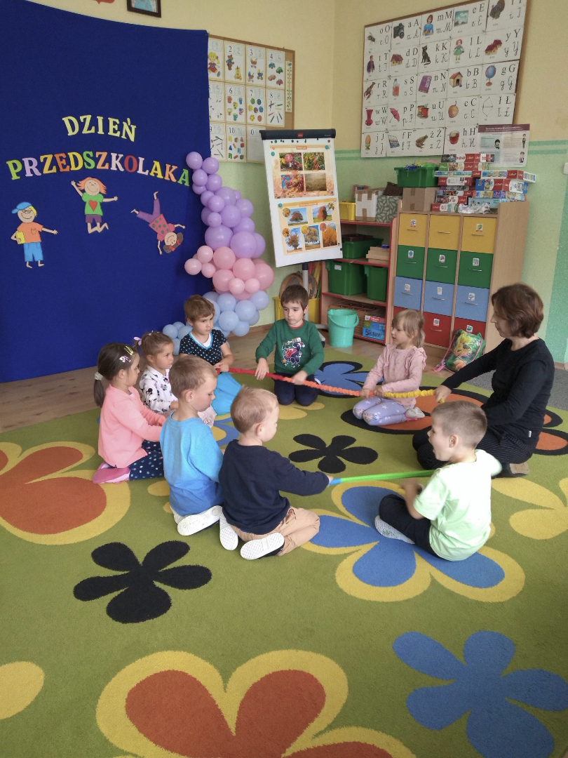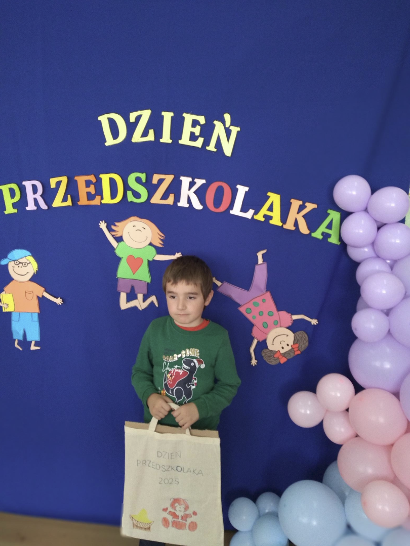 Tego dnia czekało na dzieci wiele niespodzianek i atrakcji przygotowanych przez nauczycieli, rodziców i współpracującą z nami bibliotekarkę Panią Mirosławę Siemieniuk-Morawską. W naszej sali rozbrzmiewała wesoła, skoczna muzyka i śpiew od samego rana. Bawiliśmy się w popularne zabaw grupowe, integracyjne, które powinien znać każdy przedszkolak min. Karuzela, Dwóm tańczyć się zachciało czy Boogi. Tańczyliśmy również do muzyki filmowej z kolorowymi, neonowymi chustami oraz z gumą sensoryczną. Wszystkie przedszkolaki- maluchy i starszaki z kolorowych liter układały hasło-DZIEŃ PRZEDSZKOLAKA, zapoznając się z literami, a przy okazji ćwicząc spostrzegawczość wzrokową i uwagę. Było również zadanie kreatywne- każdy projektował na lnianej ekotorbie wzór graficzny używając do tego szablonów i pisaków do tkanin. Następnie odbyła się sesja fotograficzna oraz wręczenie dyplomów i medali super przedszkolaka, a także drobnych upominków zakupionych przez rodziców.