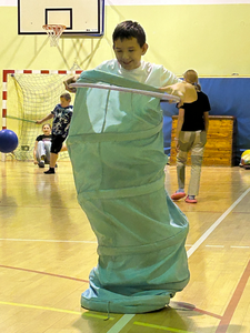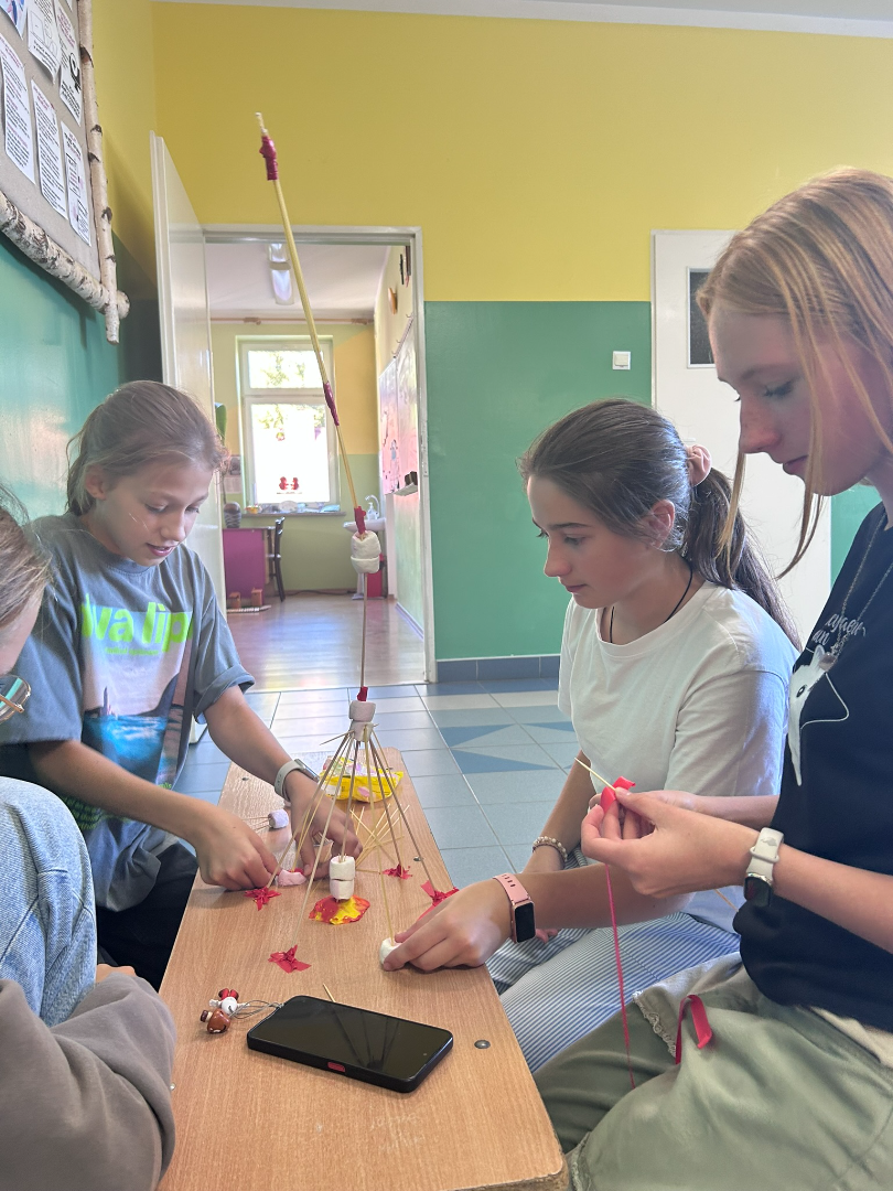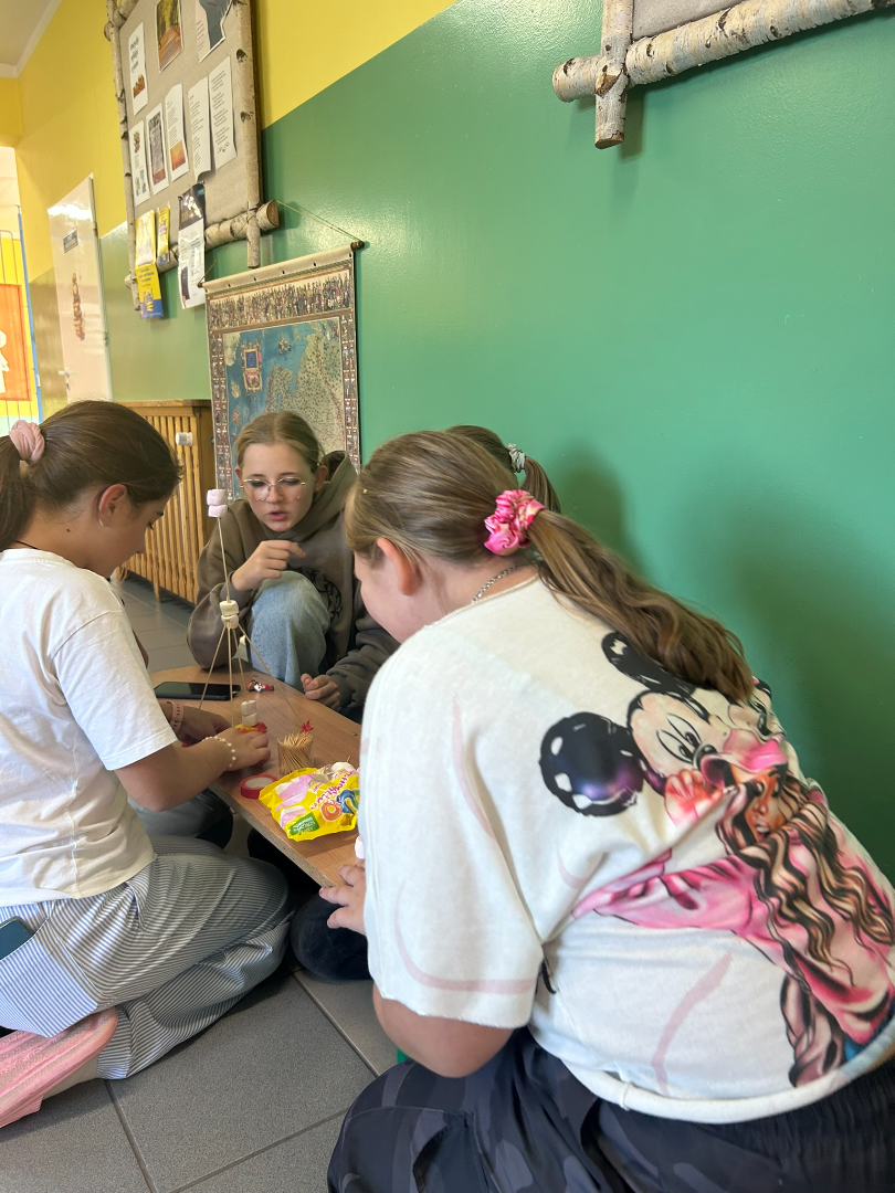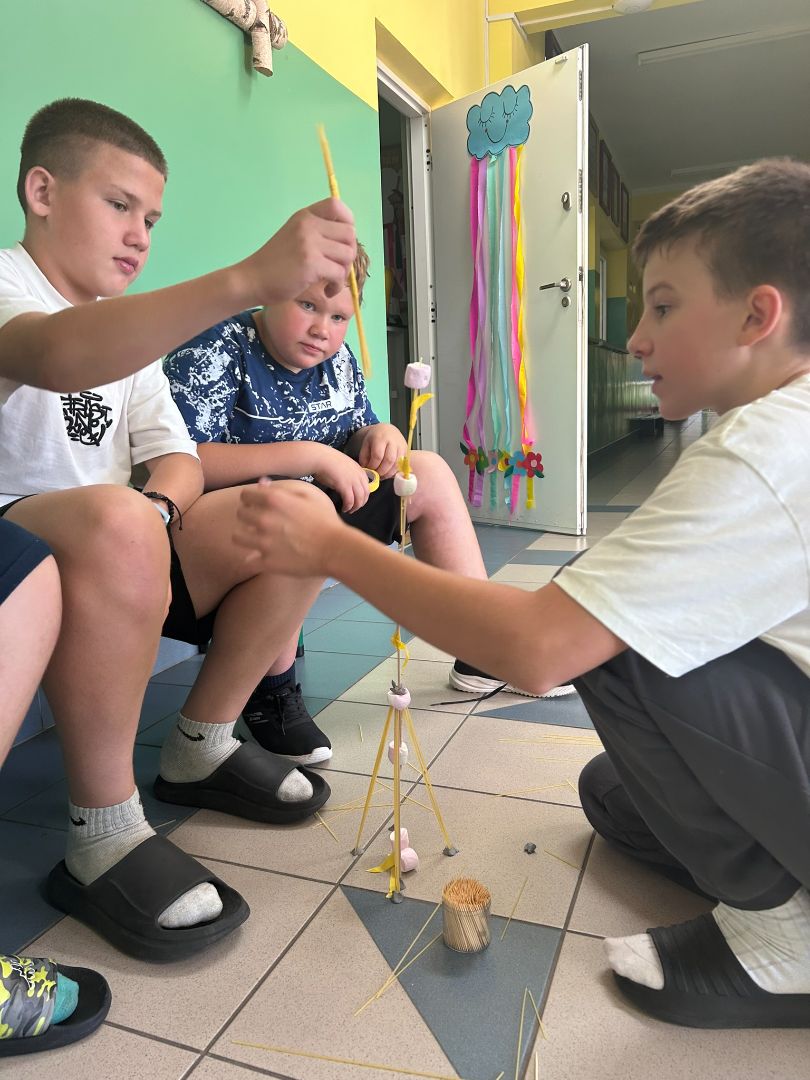 Na sali gimnastycznej rozegraliśmy mecze, które śmiało mogłyby trafić do kronik sportowych – emocje jak na mundialu! 🏆💪 A kiedy kurz opadł, przyszła pora na inżynierskie wyzwania – budowanie wież z makaronu i pianek. Konstrukcje były tak imponujące, że spokojnie można by zgłosić je do programu „Budowle świata”. 🍝🏗️