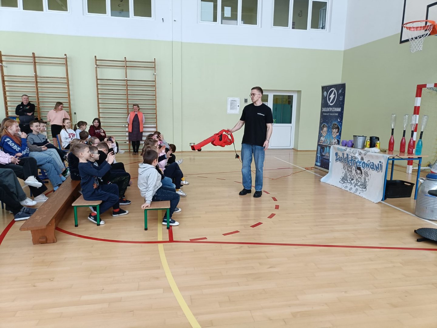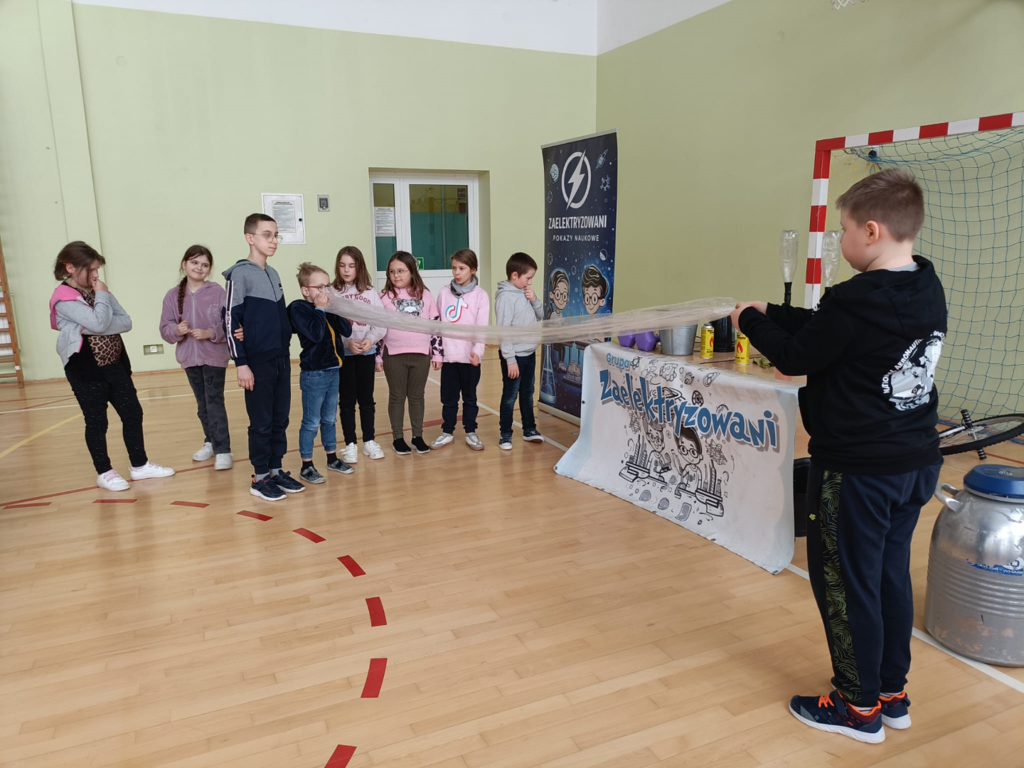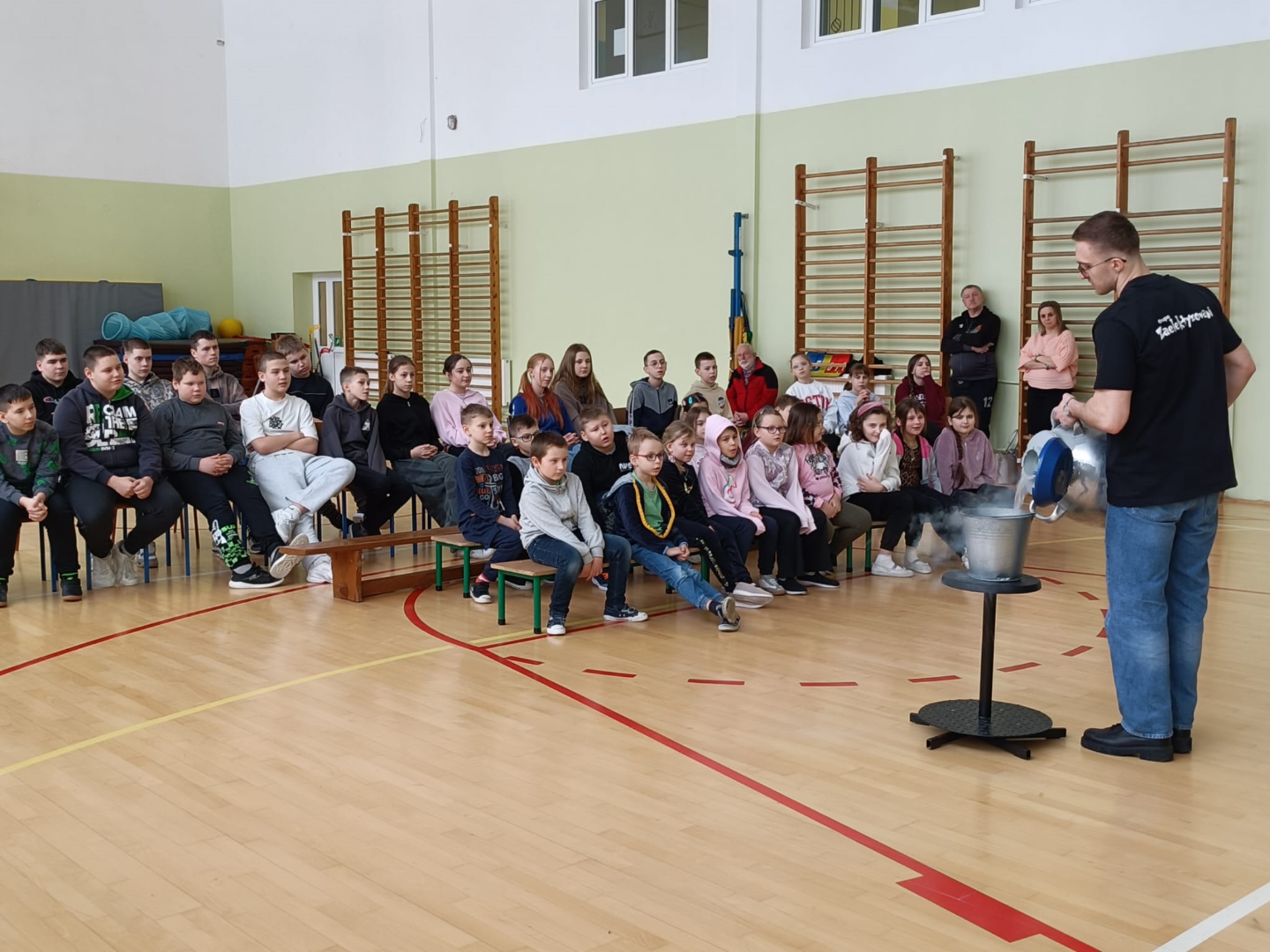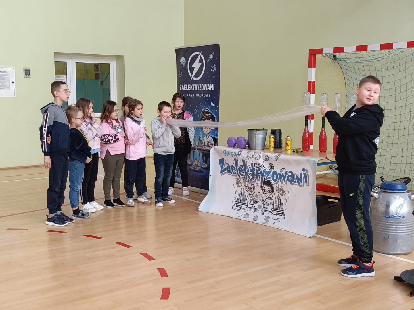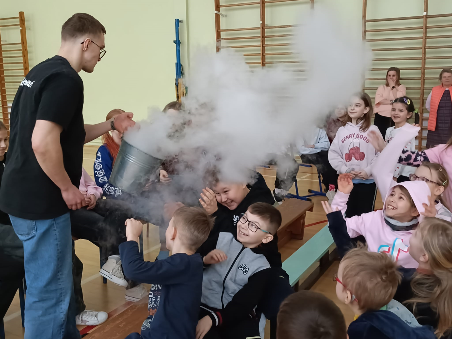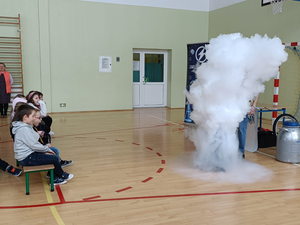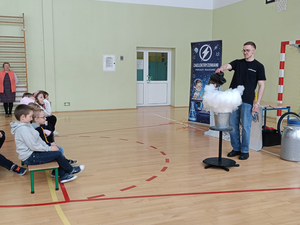 Animator w świetny sposób łączył wiedzę naukową z elementami humoru, tworząc przyjazną atmosferę i zachęcając dzieci do nauki poprzez zabawę. Spotkanie było nie tylko źródłem nowych informacji z zakresu chemii i fizyki, ale również okazją do świetnej zabawy. Uczniowie z radością i dużym zaangażowaniem uczestniczyli w pokazie, spędzając czas w sposób pożyteczny i niezwykle inspirujący.