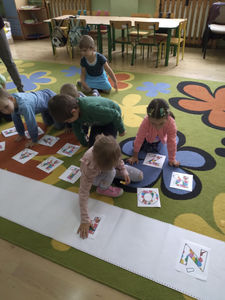 Tego dnia czekało na dzieci wiele niespodzianek i atrakcji przygotowanych przez nauczycieli, rodziców i współpracującą z nami bibliotekarkę Panią Mirosławę Siemieniuk-Morawską. W naszej sali rozbrzmiewała wesoła, skoczna muzyka i śpiew od samego rana. Bawiliśmy się w popularne zabaw grupowe, integracyjne, które powinien znać każdy przedszkolak min. Karuzela, Dwóm tańczyć się zachciało czy Boogi. Tańczyliśmy również do muzyki filmowej z kolorowymi, neonowymi chustami oraz z gumą sensoryczną. Wszystkie przedszkolaki- maluchy i starszaki z kolorowych liter układały hasło-DZIEŃ PRZEDSZKOLAKA, zapoznając się z literami, a przy okazji ćwicząc spostrzegawczość wzrokową i uwagę. Było również zadanie kreatywne- każdy projektował na lnianej ekotorbie wzór graficzny używając do tego szablonów i pisaków do tkanin. Następnie odbyła się sesja fotograficzna oraz wręczenie dyplomów i medali super przedszkolaka, a także drobnych upominków zakupionych przez rodziców.